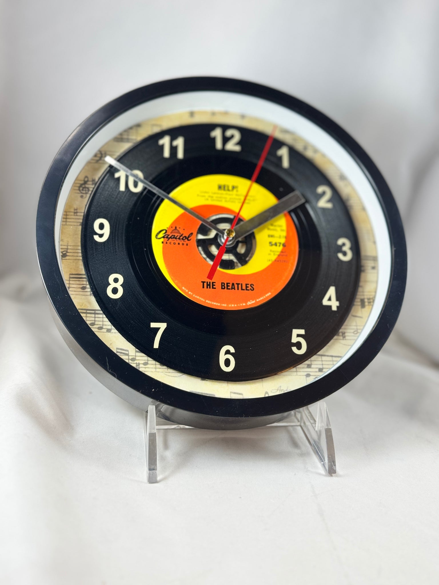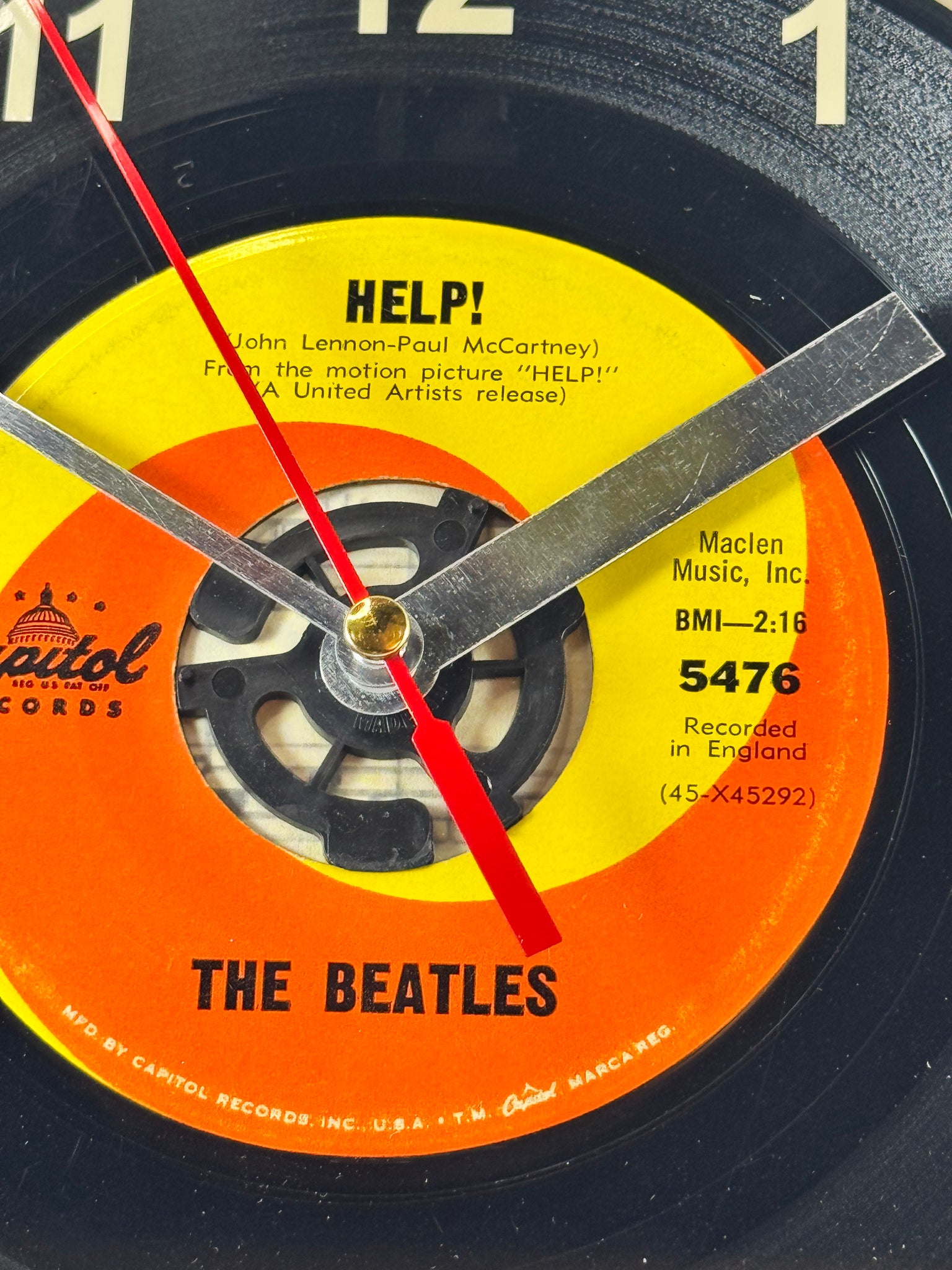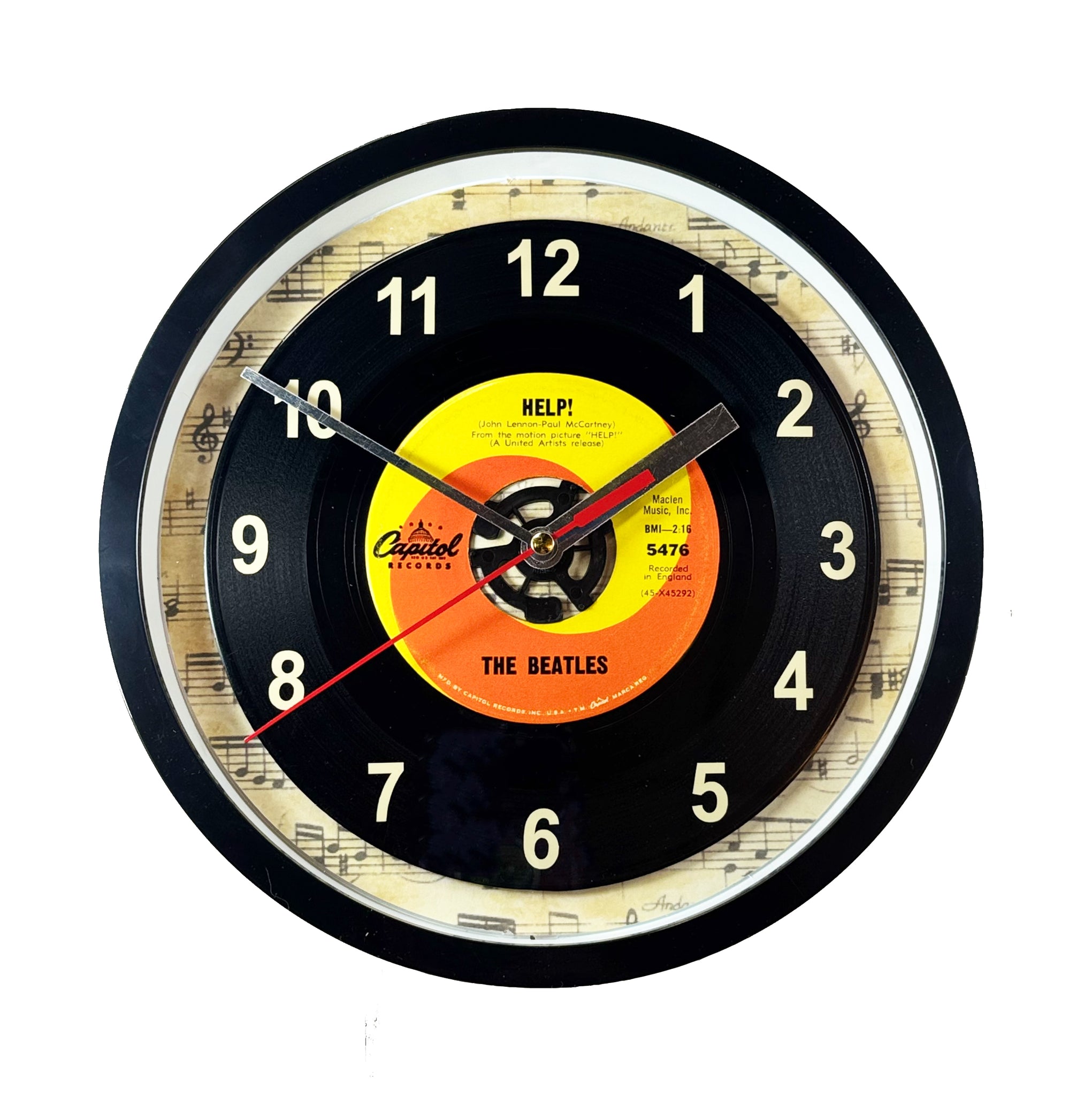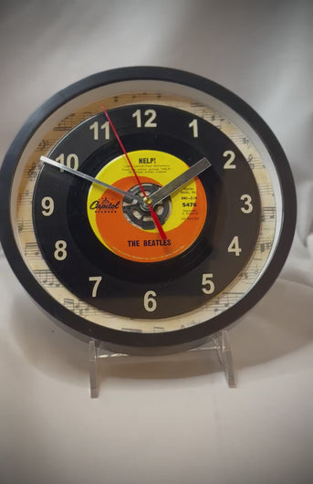 Beatles "Help!" 45 rpm Record Clock, with off-white vinyl number decals to coordinate with the label, encased in a wall clock with a plastic frame and a glass cover.