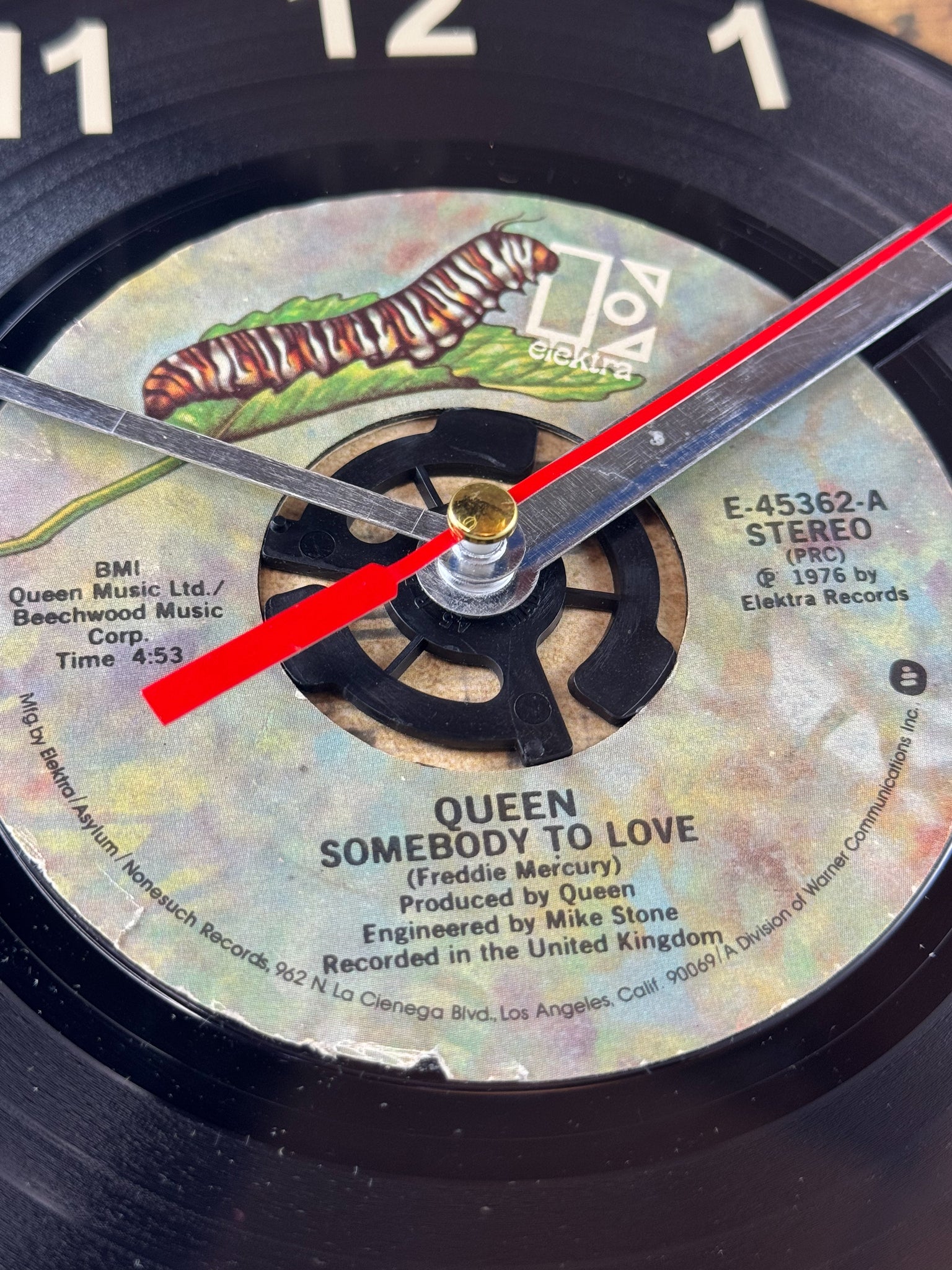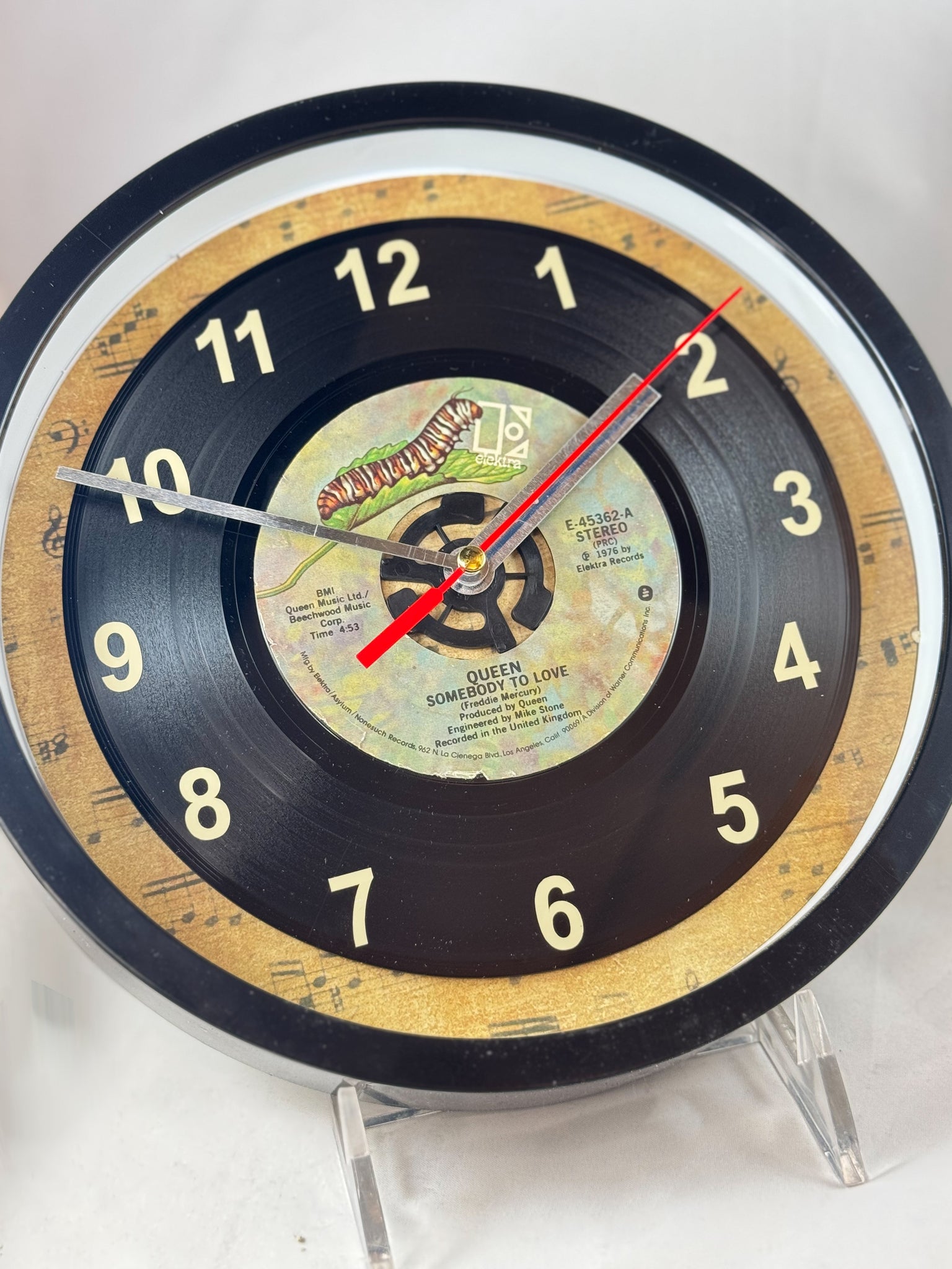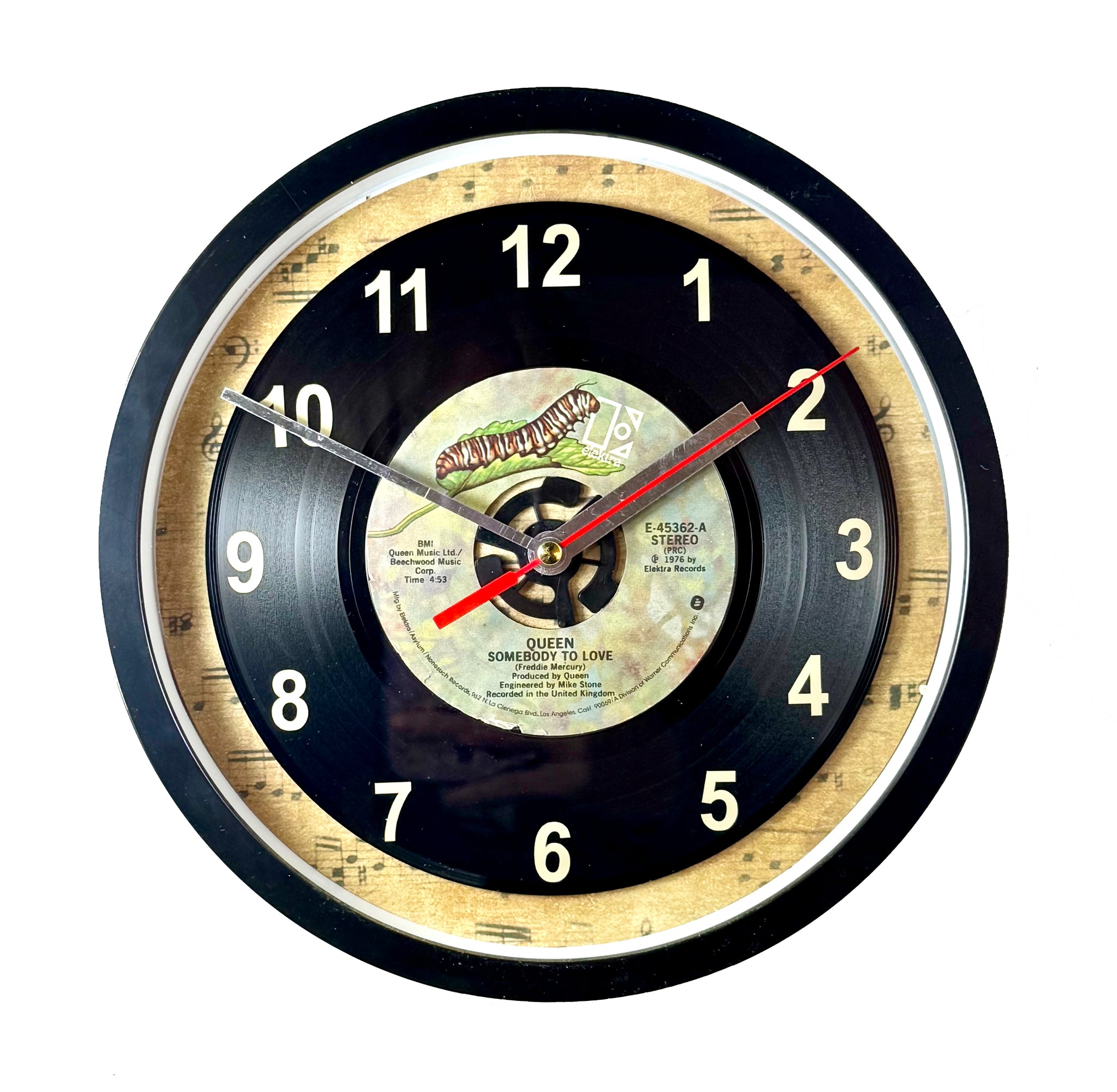 Queen "Somebody To Love" 45 rpm Record Clock, with off-white vinyl number decals to coordinate with the label, encased in a wall clock with a plastic frame and a glass cover.