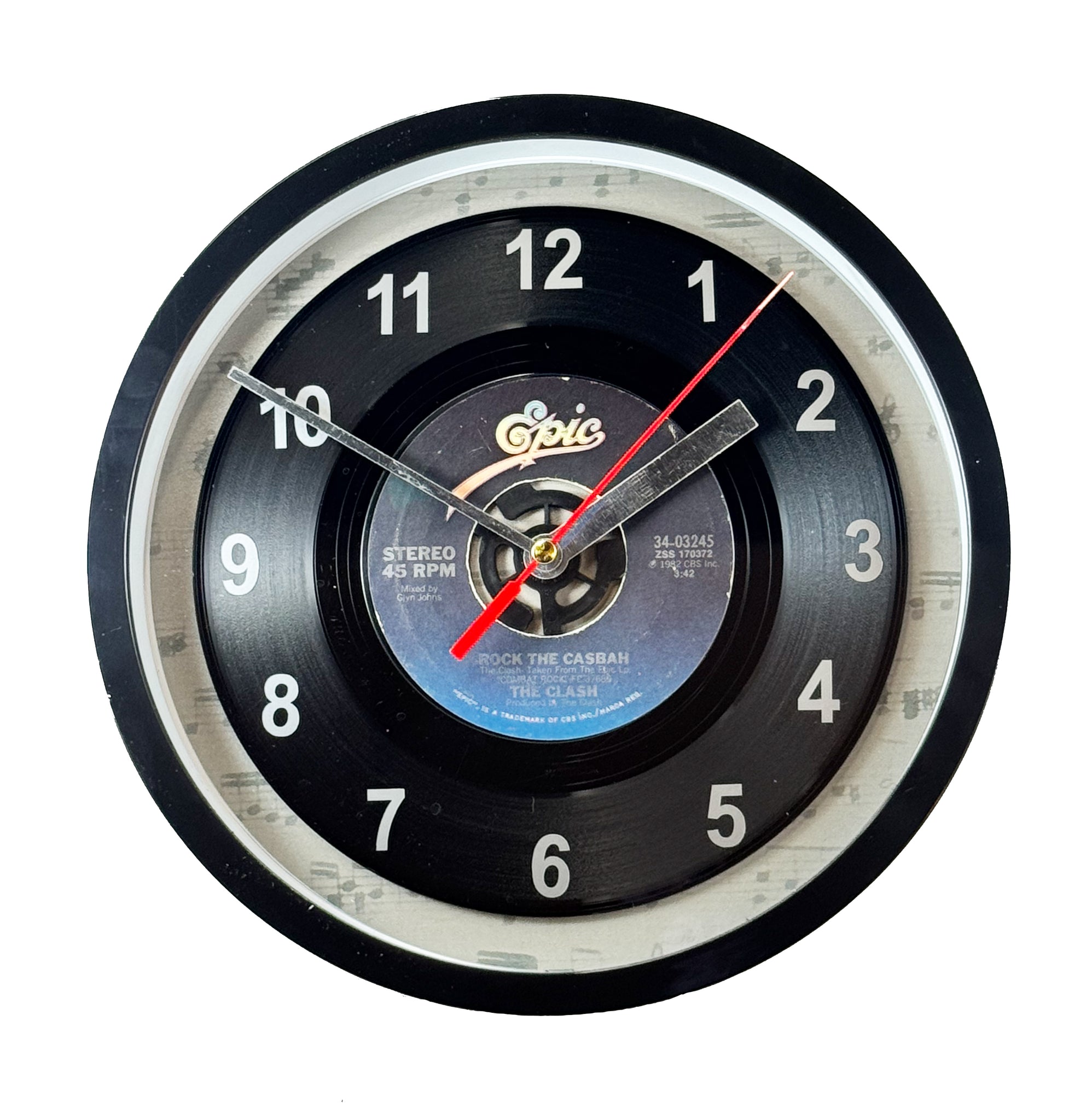 The Clash "Rock The Casbah" 45 rpm Record Clock, with silver colored vinyl number decals to coordinate with the label, encased in a wall clock with a plastic frame and a glass cover.