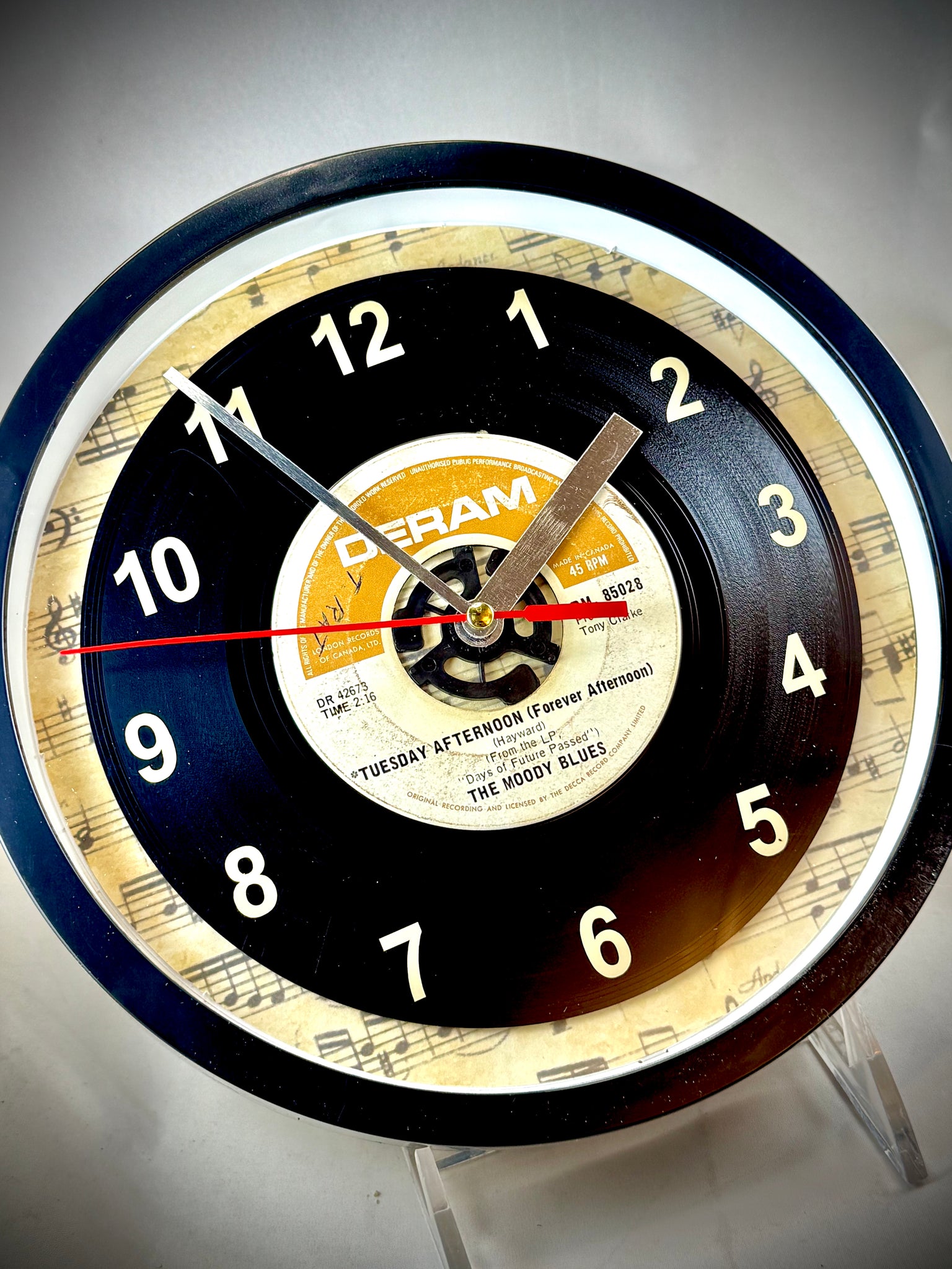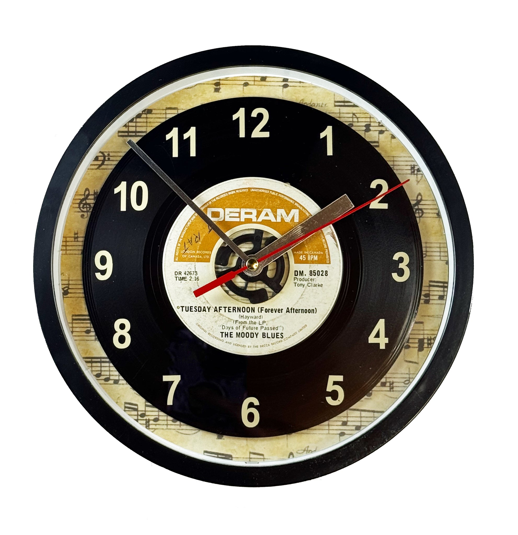The Moody Blues "Tuesday Afternoon (Forever Afternoon)" 45 rpm Record Clock, with off-white vinyl number decals to coordinate with the label, encased in a wall clock with a plastic frame and a glass cover.